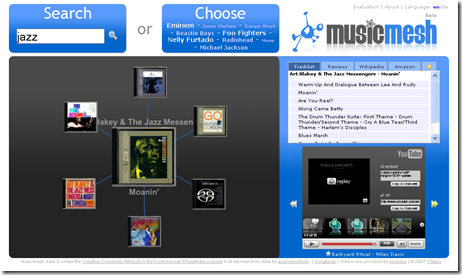 Musicmesh est un site qui propose de rechercher de la musique sur internet à l' aide d' une carte , actionnable et sensible aux clics de la souris.