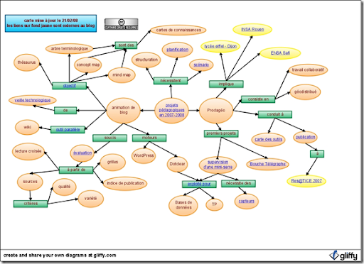 Avec l'outils de cartographie conceptuelle et de construction d'organigrammes Gliffy.com , les professeurs et les étudiants ont construit un exemple éloquent de ce que l'on peut faire de mieux avec cet outils : un plan complet du blog, avec des liens actifs. L'ensemble de l'information est structuré et mis en scène pour faciliter sa compréhension, on ne saurait être plus cohérent ! Cliquer sur l'image pour accéder à la carte.